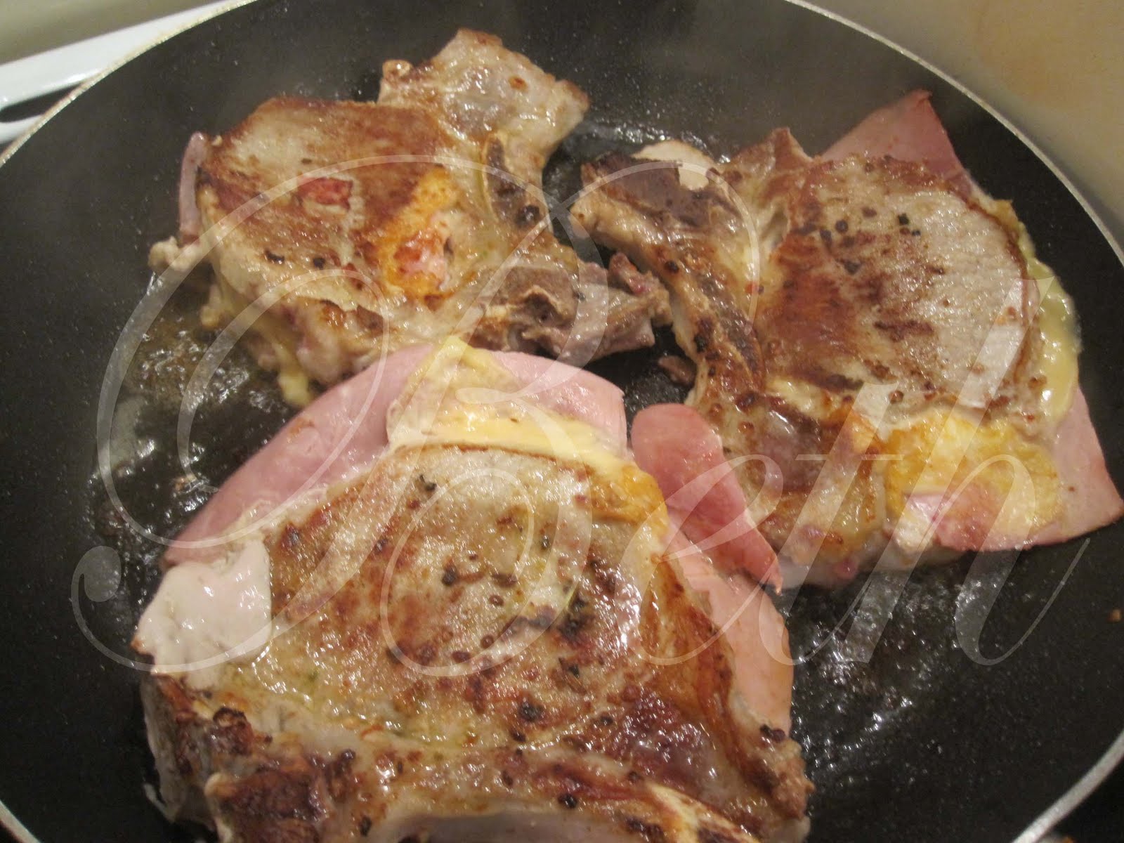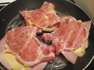 Recheie as costeletas com uma fatia de queijo e metade de uma fatia de fiambre (ver foto).