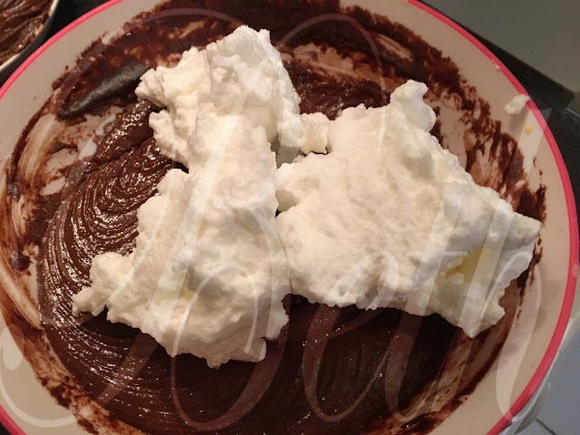 Bata as natas em chantilly e adicione-as a preparação anterior delicadamente, retire a forma do frigorifico e verta a preparação dentro.