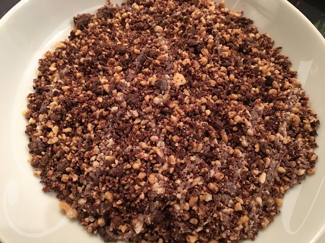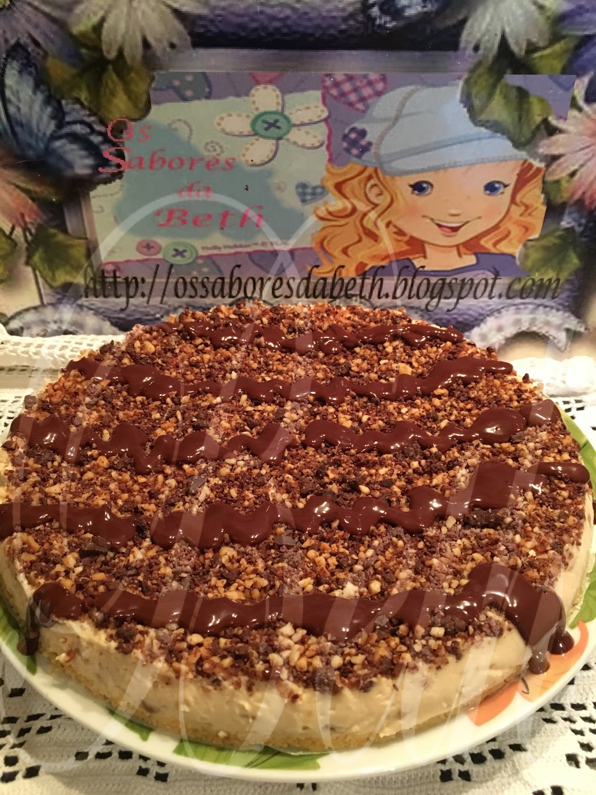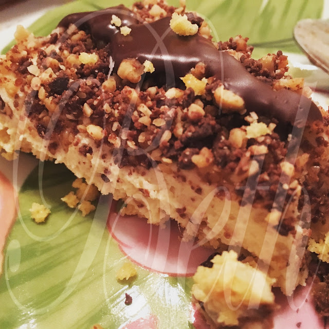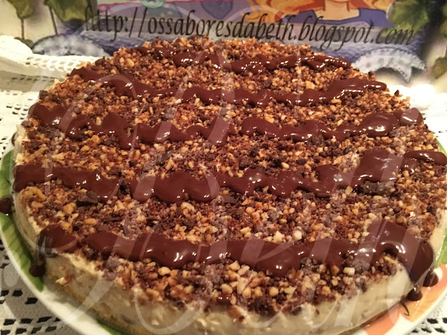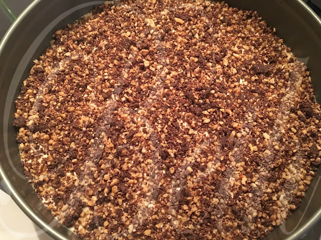 Triture no robot os amendoins (40 gr) juntamente com o chocolate (50 gr) verta sobre o cheesecake.