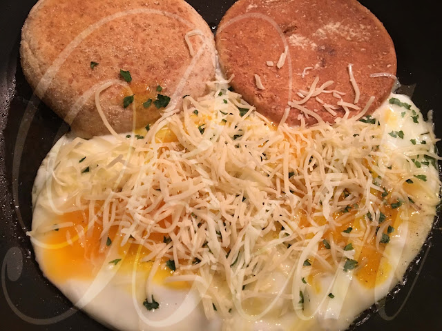 saler et poivre, et saupoudrez avec le persil et fromage râper, laisser les oeufs cuirs un peut et déposer le muffin sur les oeufs et retourner.