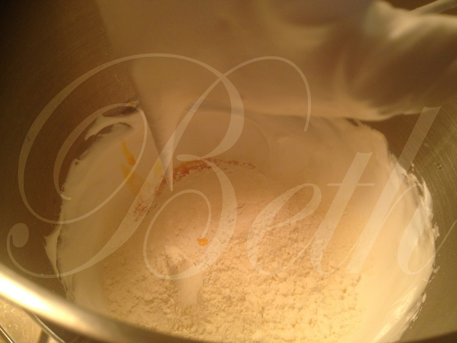 Bater as claras em castelo, junte o açucar , as gemas e a maizena, misture tudo a vel 4 durante 2 minutos.