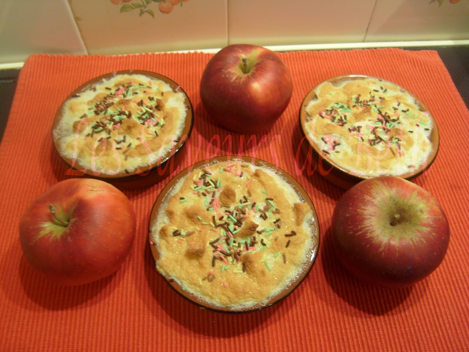 Placer les blancs d’œufs bien battus par-dessus la compote de pommes dans les ramequins.
