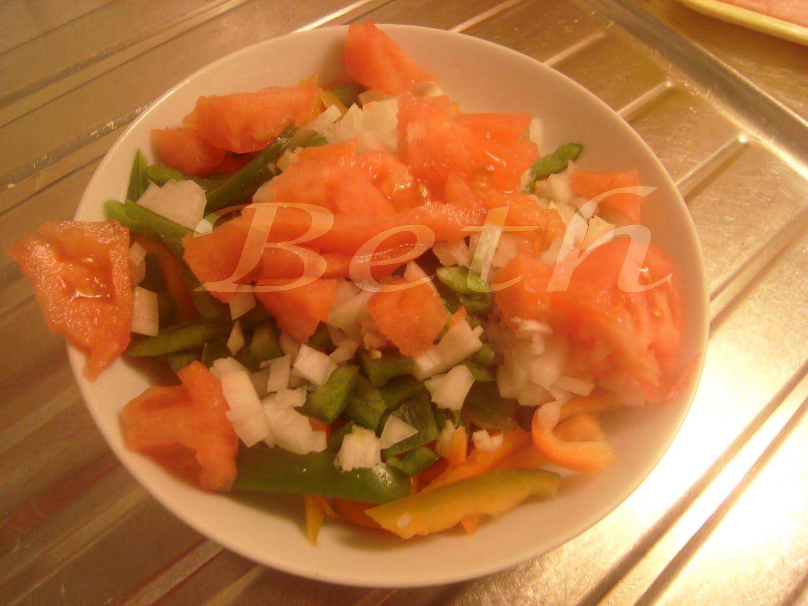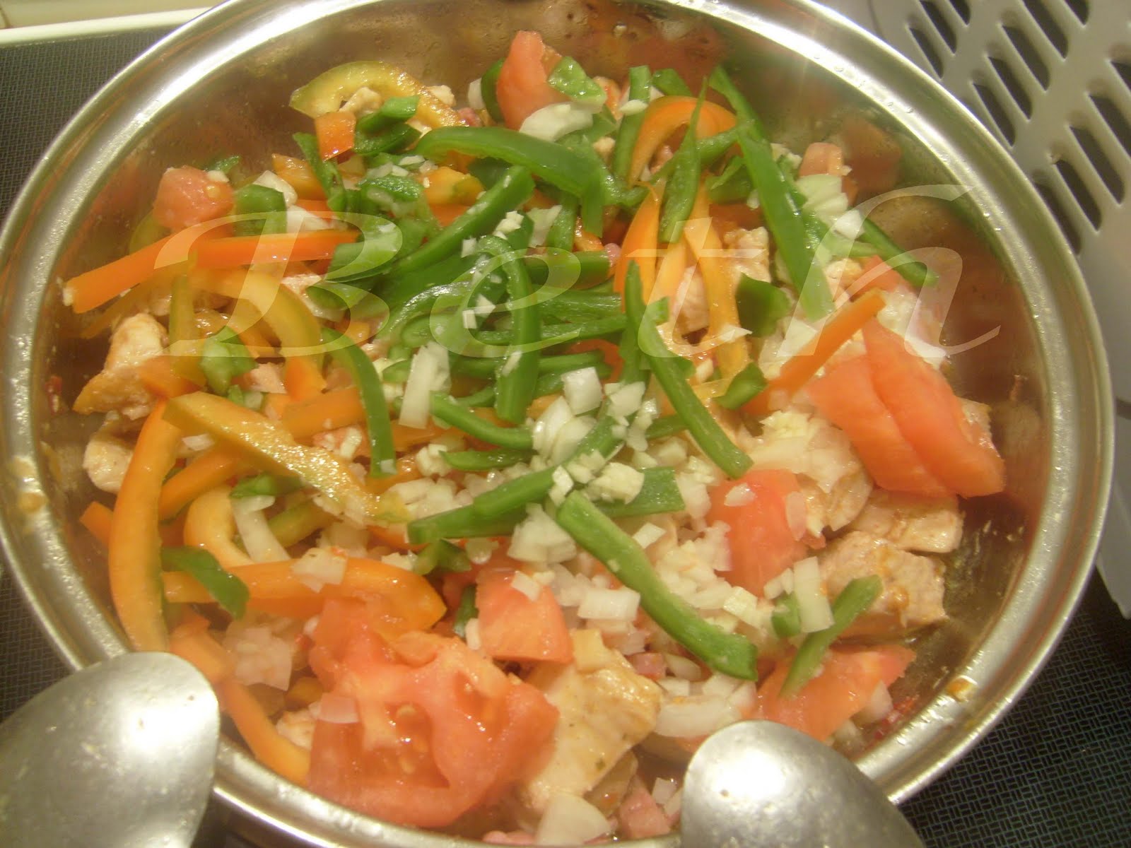 Adicionar os pimentos partidos em cubos e em laminas, a cebola picada, o alho , a cerveja, polpa de tomate este partido em bocados ,sal, pimento e piripiri e por ultimo a àgua.