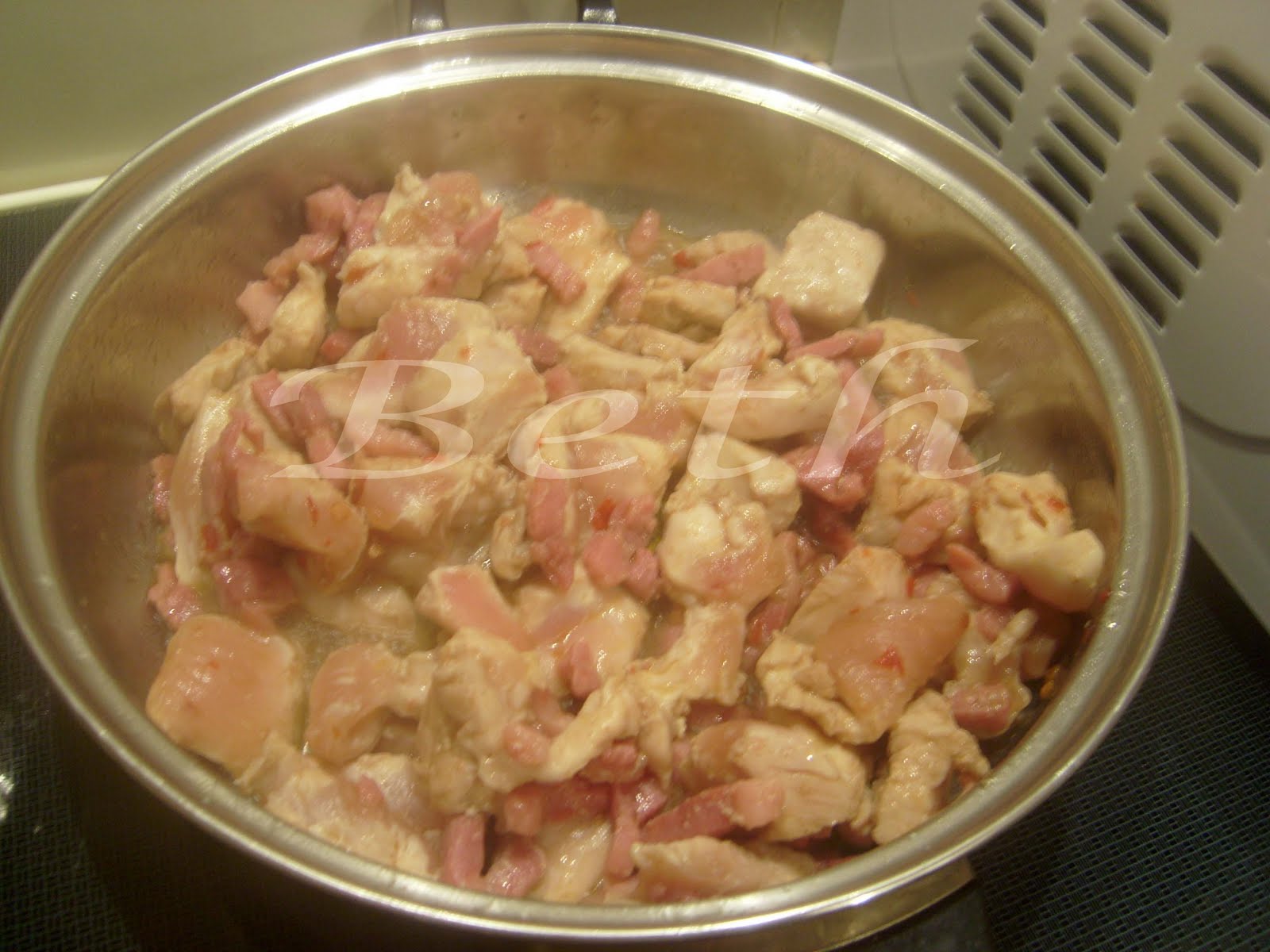 Colocar ao lume um tachinho bem grande, adicionar o bacon e deixar uns minutos até obter um pouco de gordura, juntar entam o frango partido aos pedaços, verter o azeite e deixar cozinhar mais ao menos 15 minutos sem esquecer de mecher de vez em quanto.