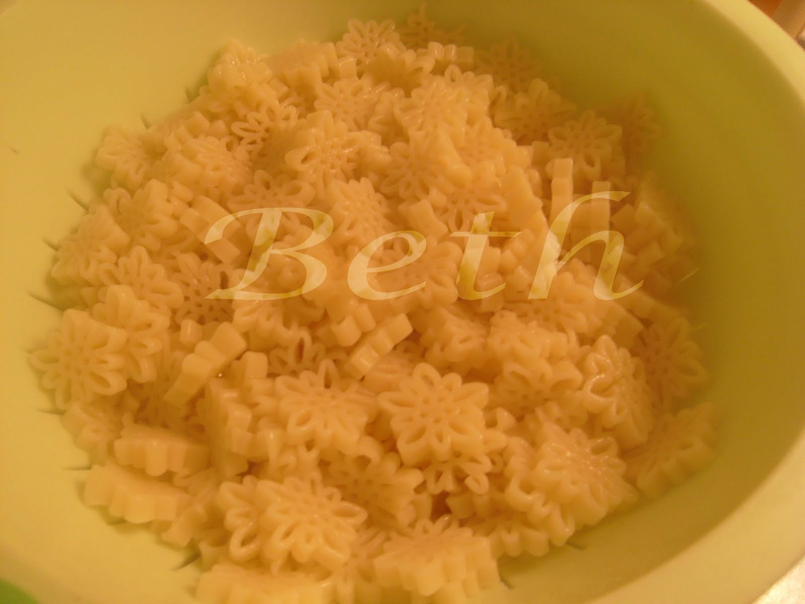 A massa estando cozida, escorre-la e passa-la por àgua fria colocando-a de seguida numa travessa bastante grandinha .