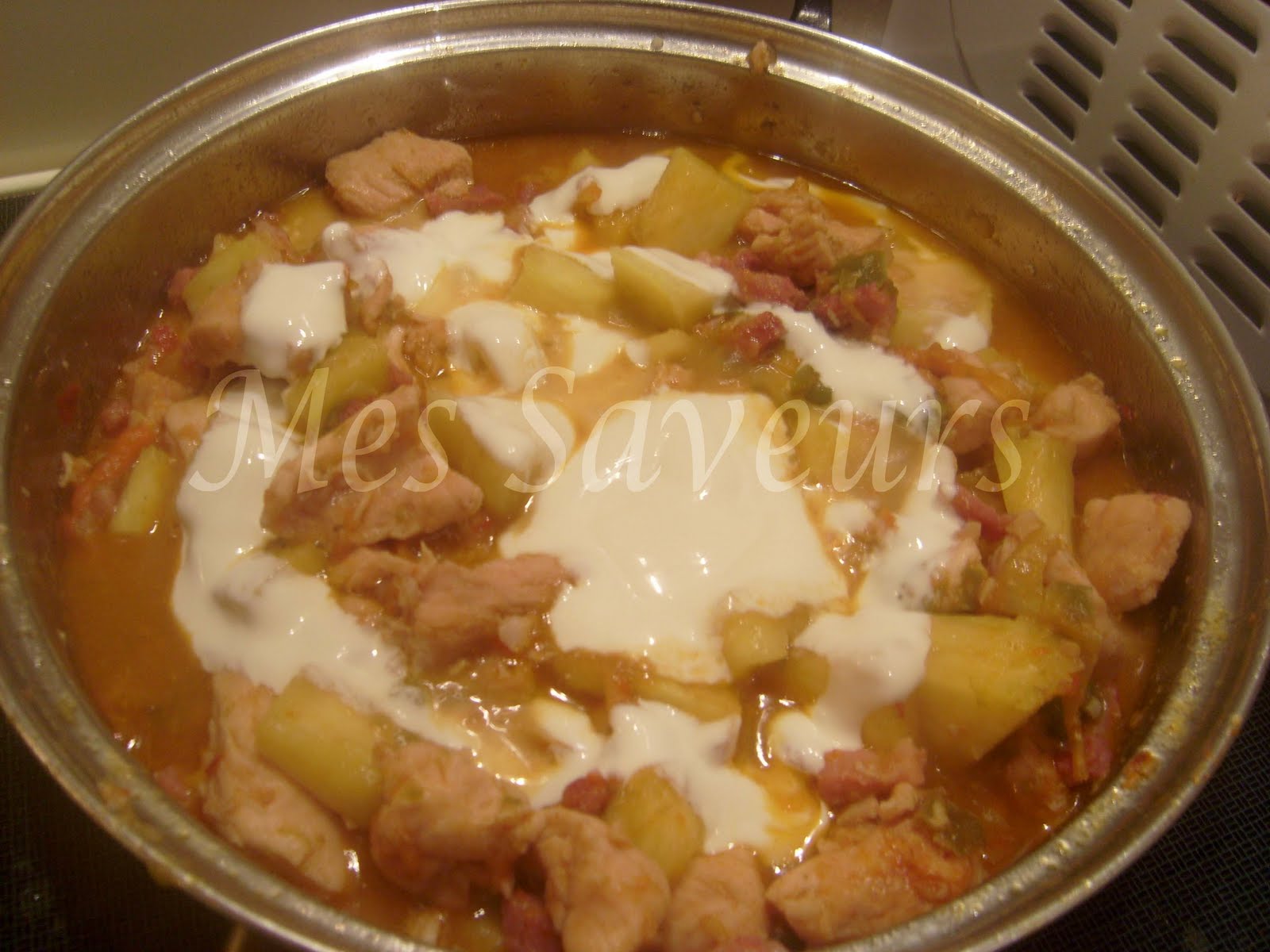 Voltando ao tacho do frango, adicionar o ananas e as natas, verifique os temperos e reduza ao lume .