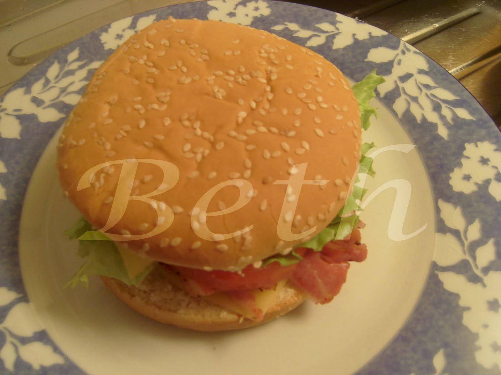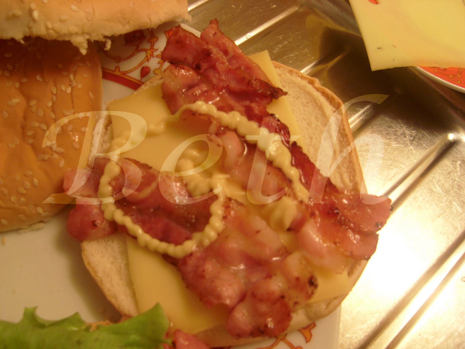 Abra o pão coloque em primeiro 1 fatia de queijo, seguida do bacon , do tomate, da mayonnaise, hamburger, outra fatia de queijo, de novo bacon e por ultimo a alface acabando por colocar mais um pouco de mayonnaise.