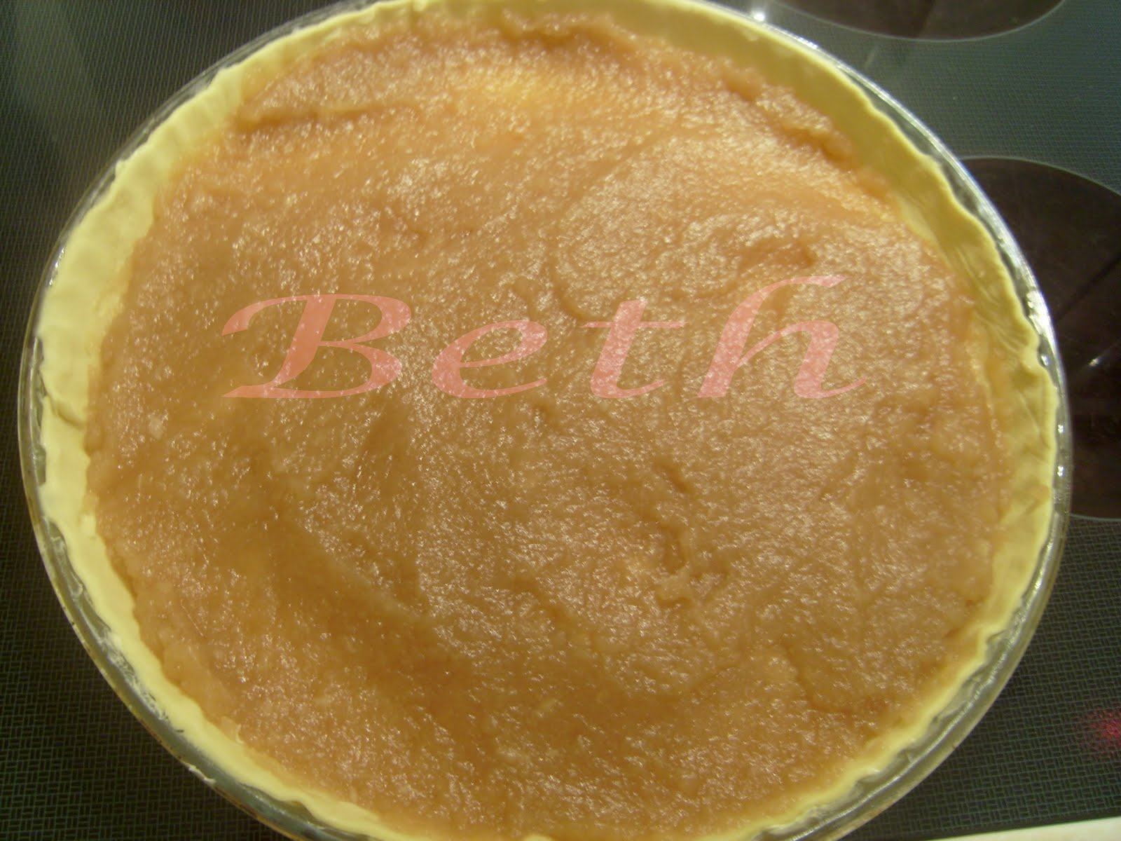 Placer dans le moule la première pate, recouvrez la totalité de votre pate avec la compote de pommes.