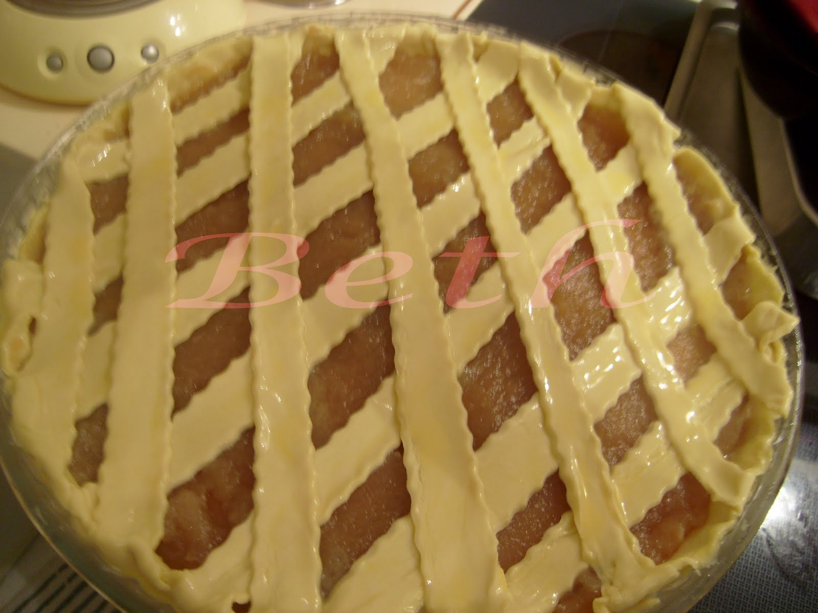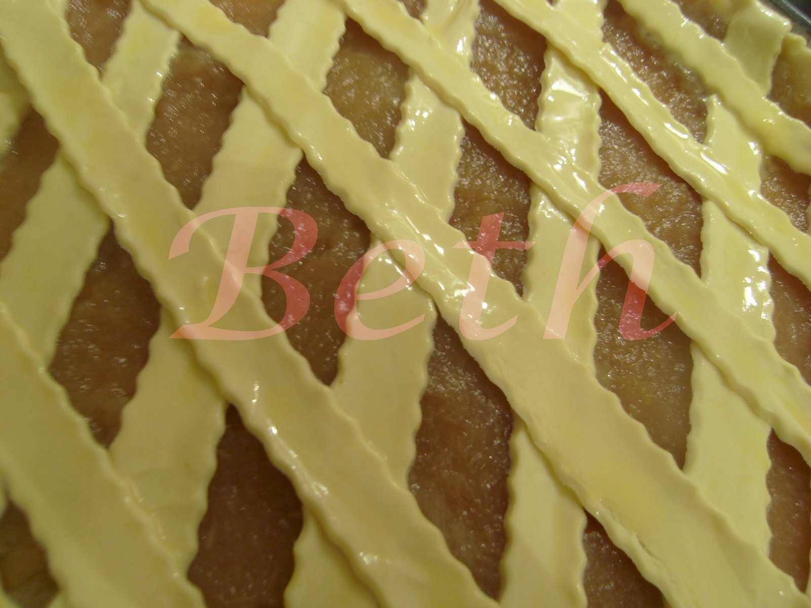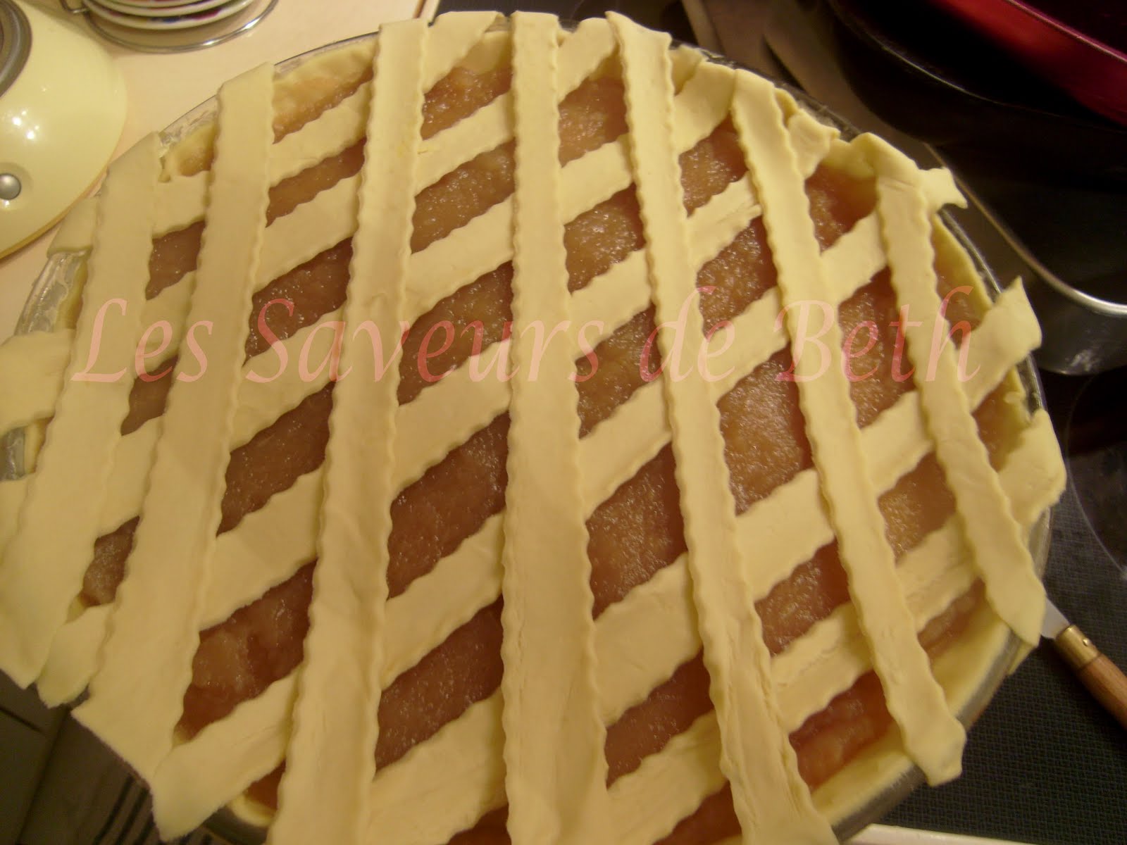 Placer une par une sur la tarte en lui donnant la forme de losange (comme dans la photo).