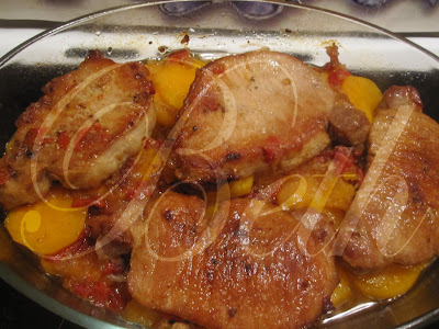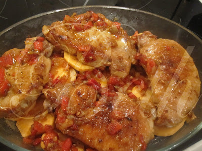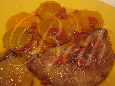 Coloque as rodelas de batata-doce, num prato de barro fundo ; de seguida junte a carne e regue com o vinho branco.