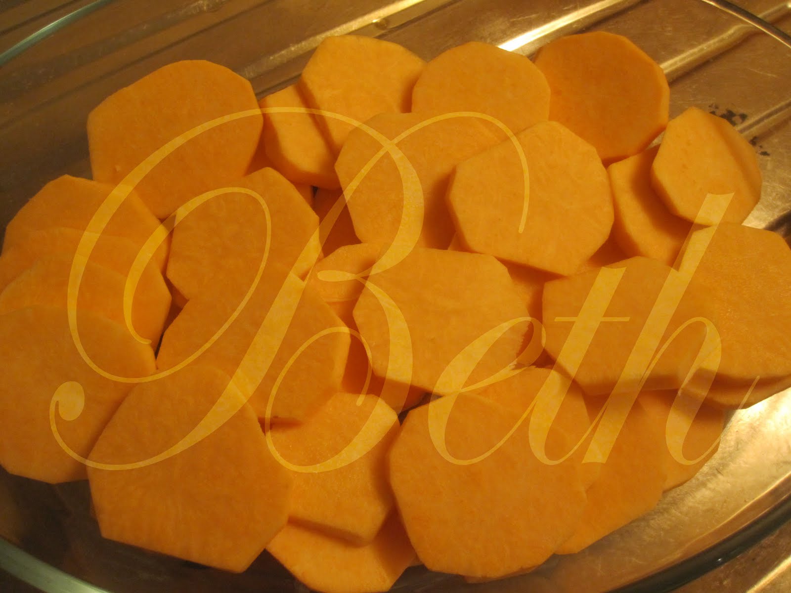Lave as batatas, descasque-as e corte-as em rodelas tambem grossas.