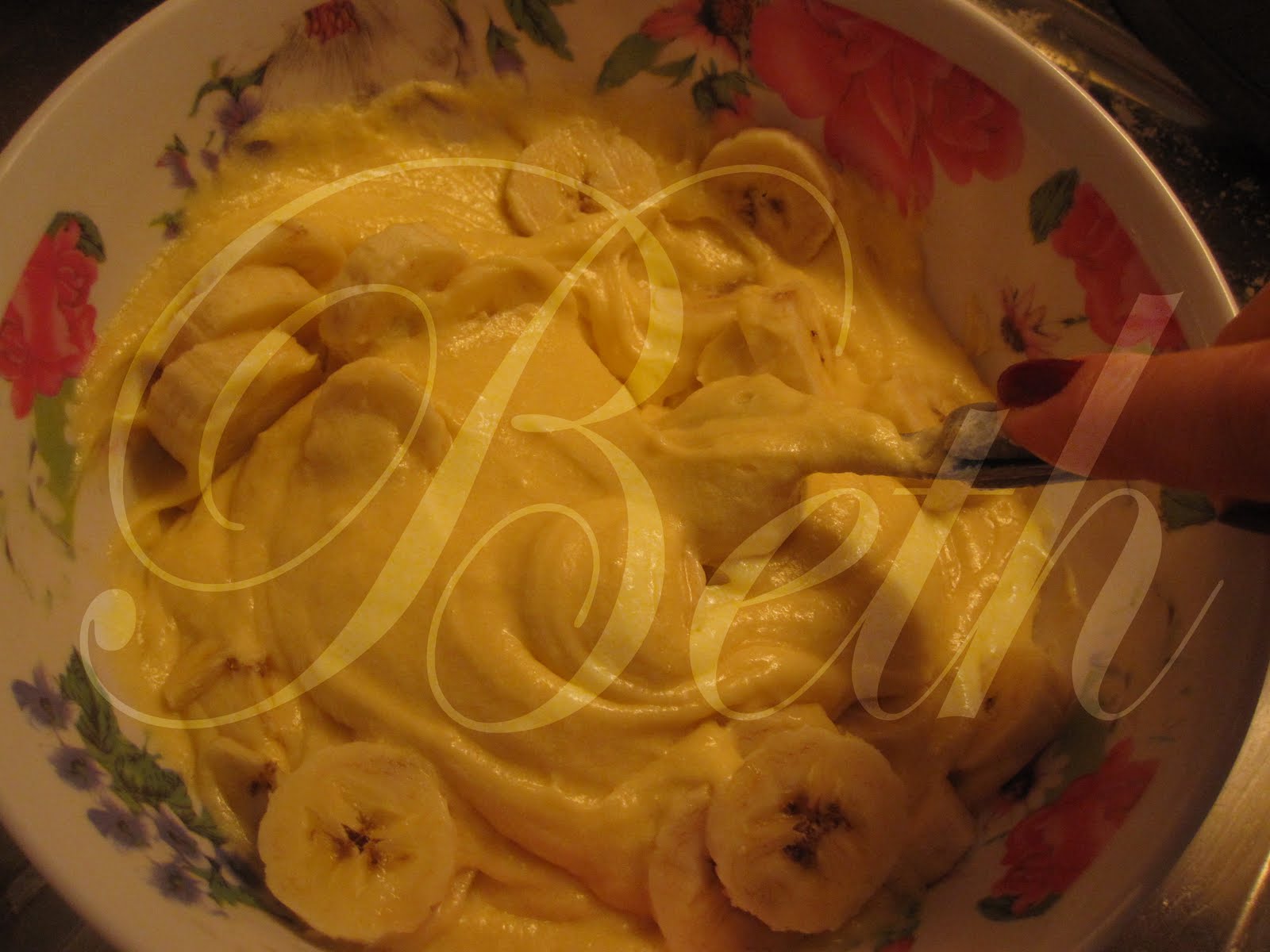 Dans l’autre, ajoutez la banane coupée en rondelles que vous incorporerez