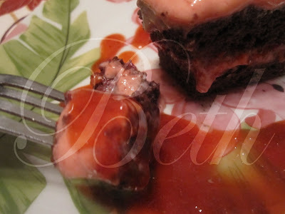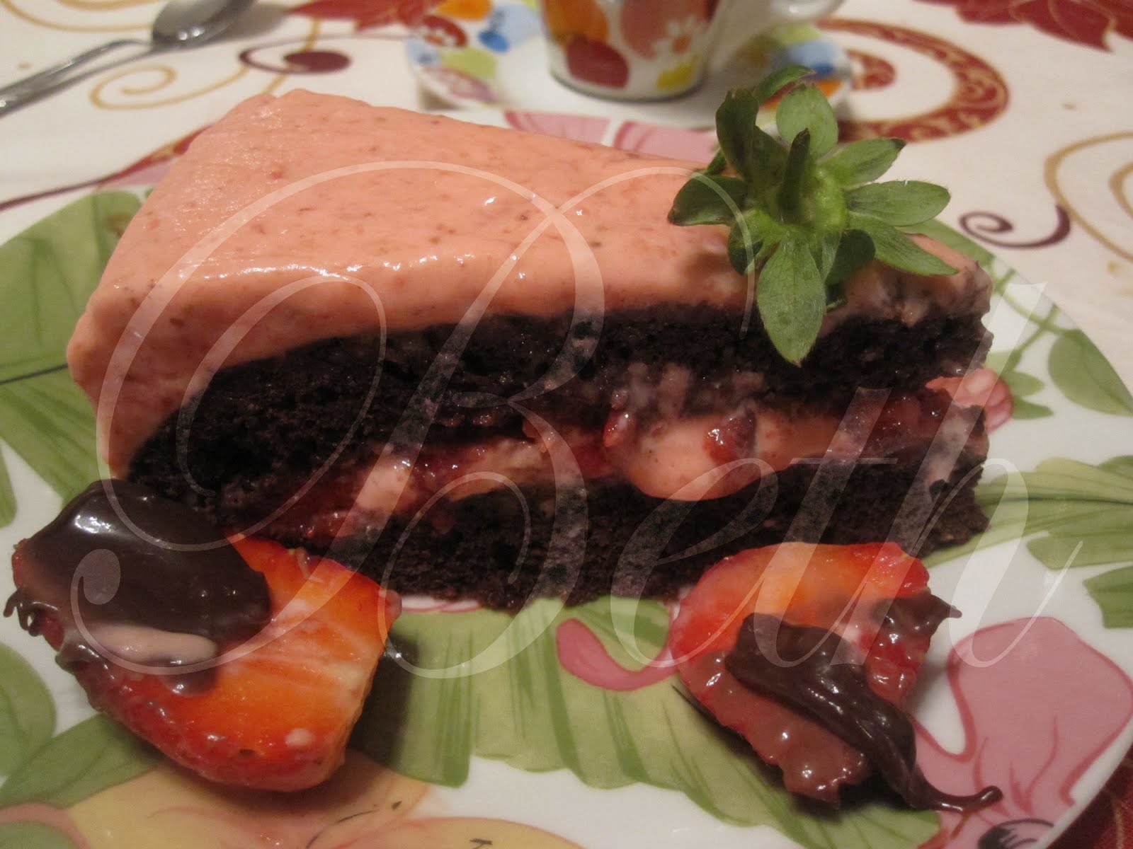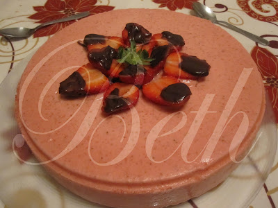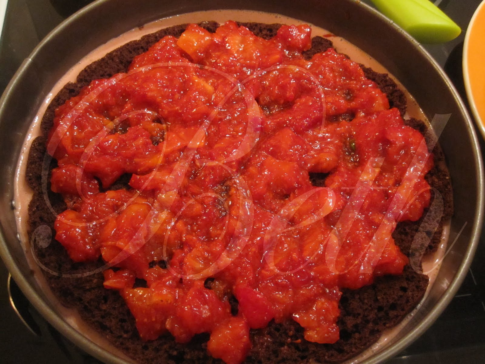 Coloque em primeiro lugar a mousse de morangos (ver foto), seguindo de uma metade do biscoito (ver foto), coloque por cima do biscoito os morangos esmagado, verta uma segunda camada de mousse de morangos e por ultimo coloque a outra metade do biscoito.