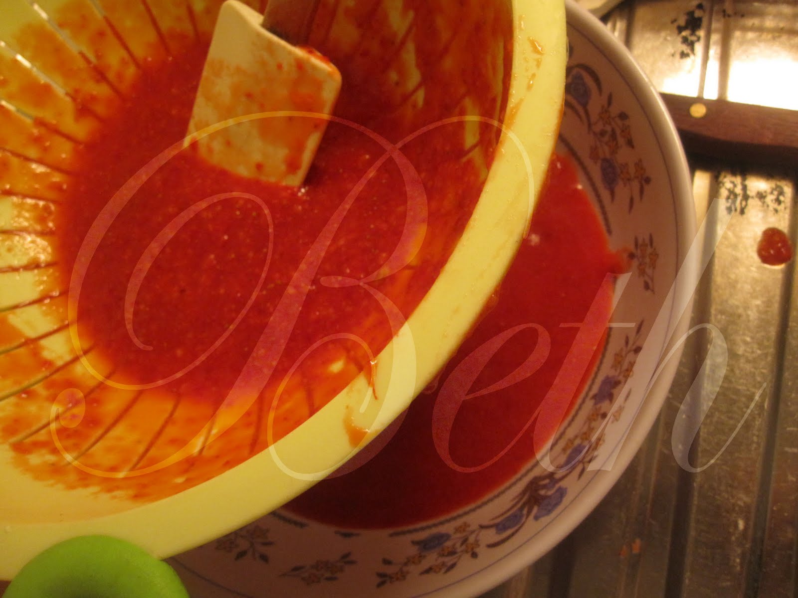 Triture no robot os restantes morangos, passado de seguida o puré de morangos por um esquador para retirar as paquenas pivedes.