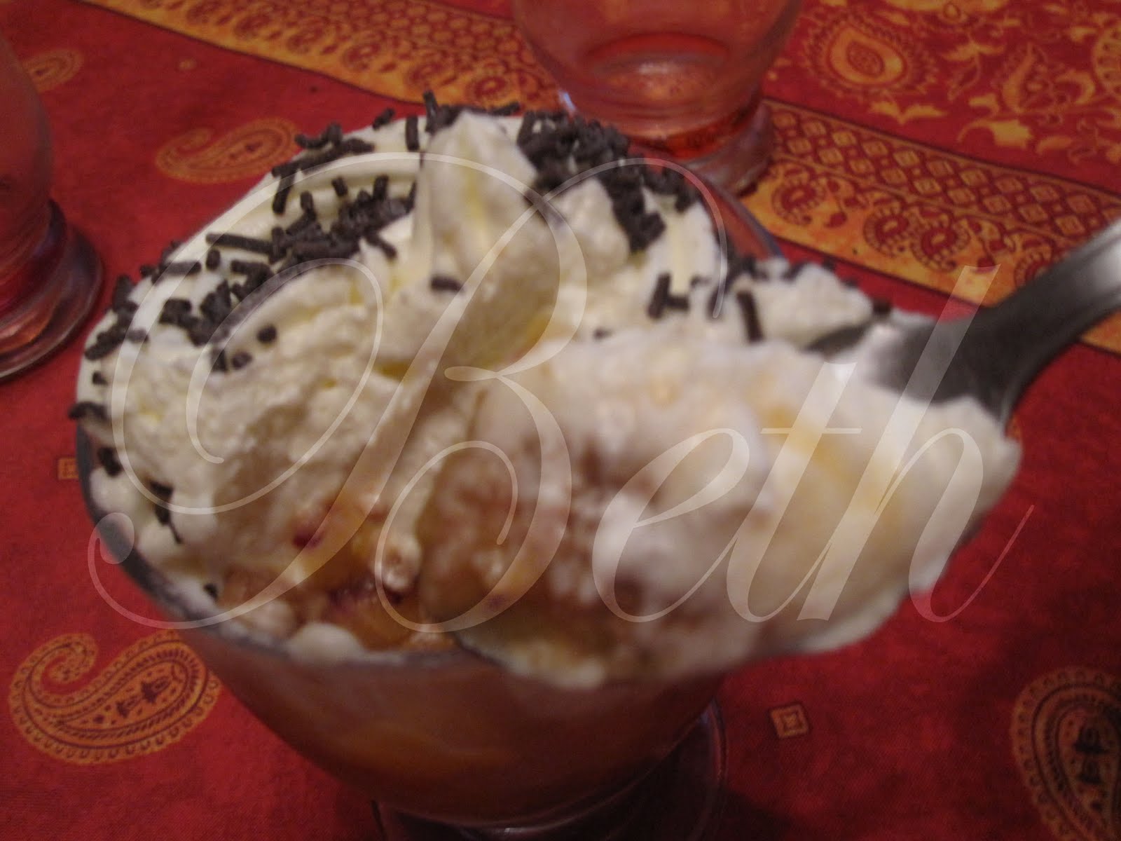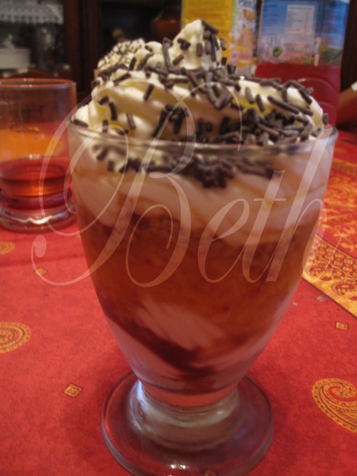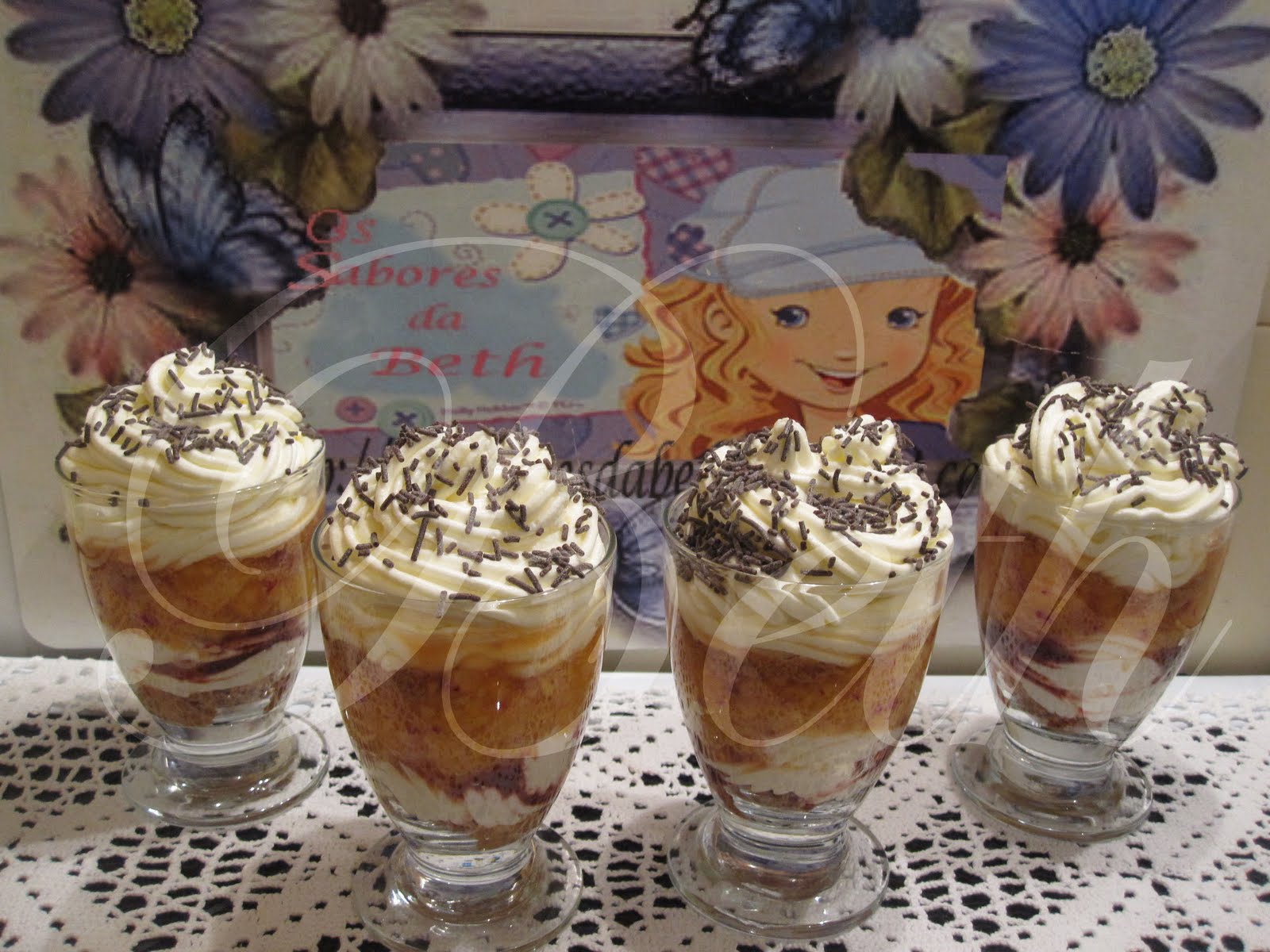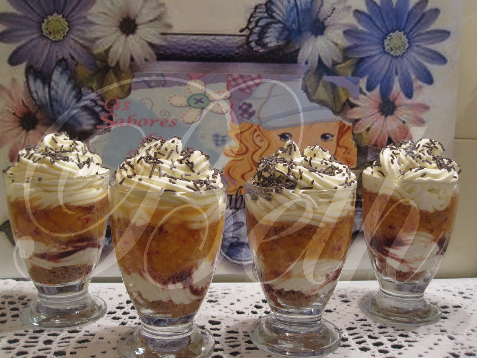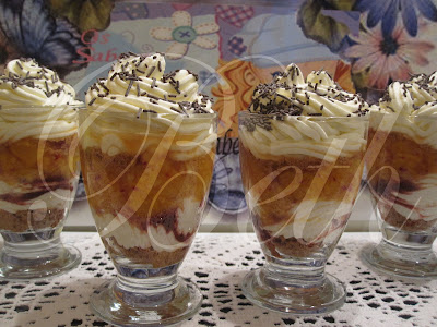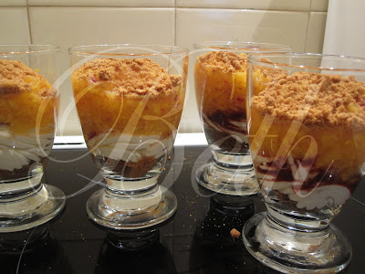 Coloque o chantilly dentro de um saco de pasteleiro e verta dentro das taças até meia taça, de seguida coloque um fio do sirop de frutos silvestres, coloque 4 colheres de sobremesa dos pêssegos em cada taça por cima du sirop, cubra novamente com mais 1 c. de sobremesa de spéculoos e acabe por encher bem as taças com o resto do chantilly.