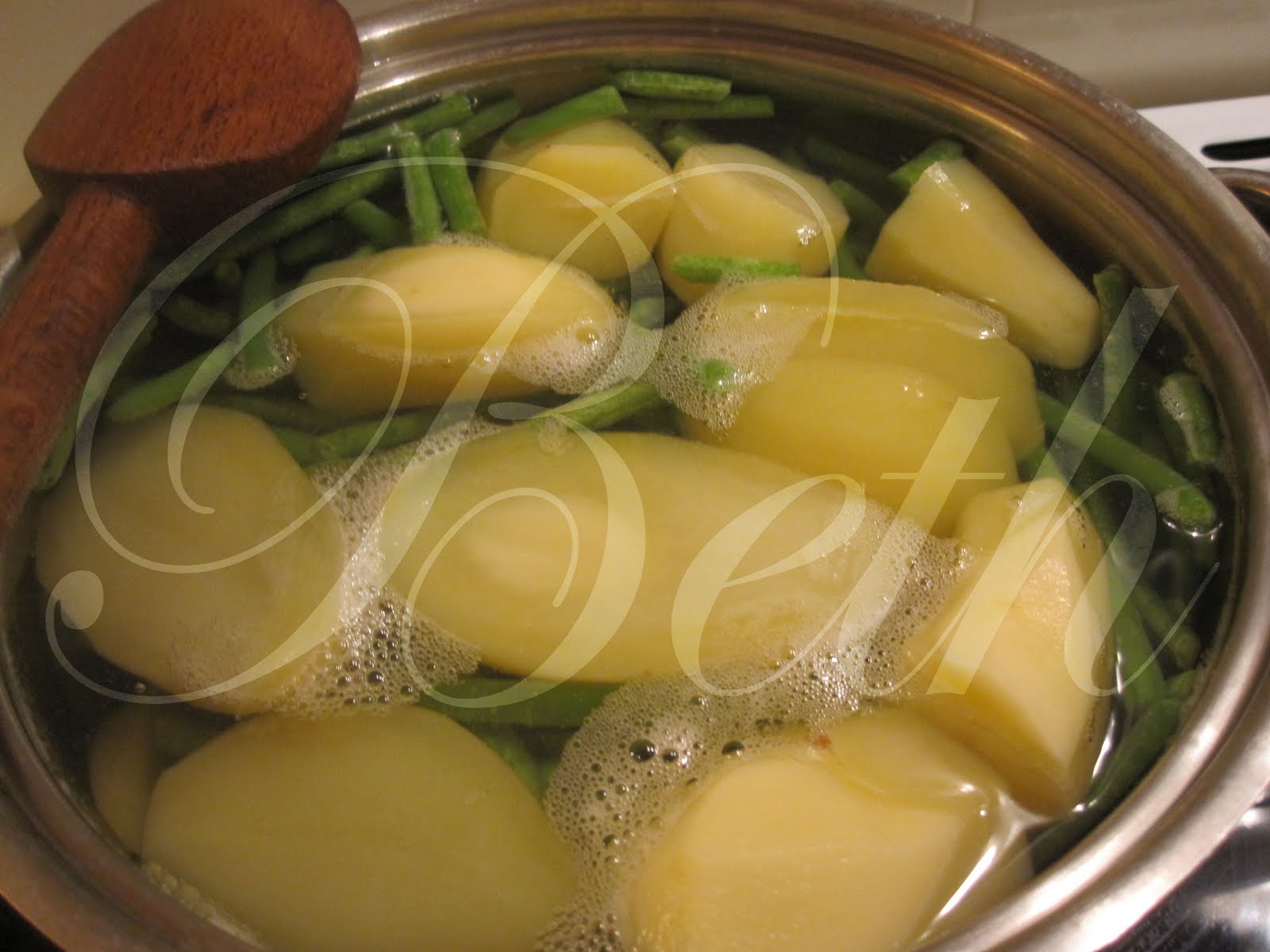 Adicione o feijão verde (congelado) e as batatas e deixe cozer novamente por mais 15 minutos.