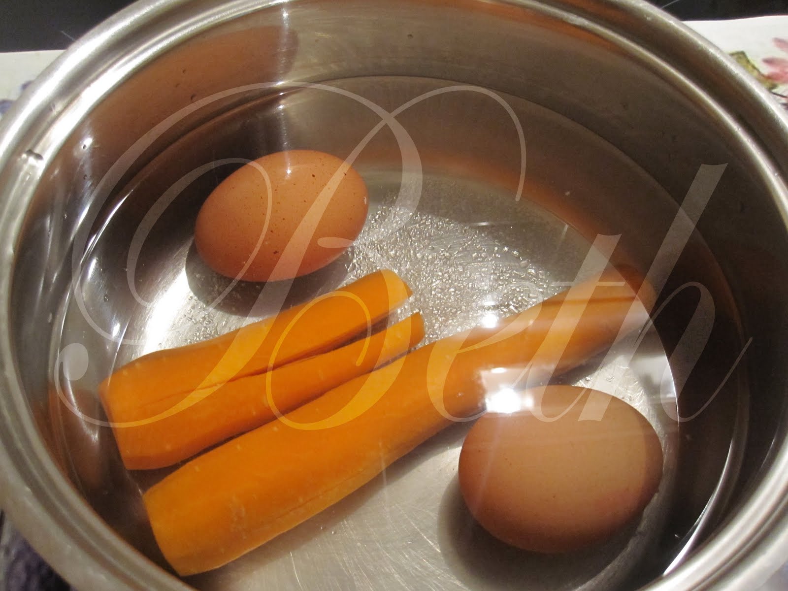 Coloque em primeiro lugar dentro do tacho as cenouras e os ovos e deixe cozer durante 20 minutos.