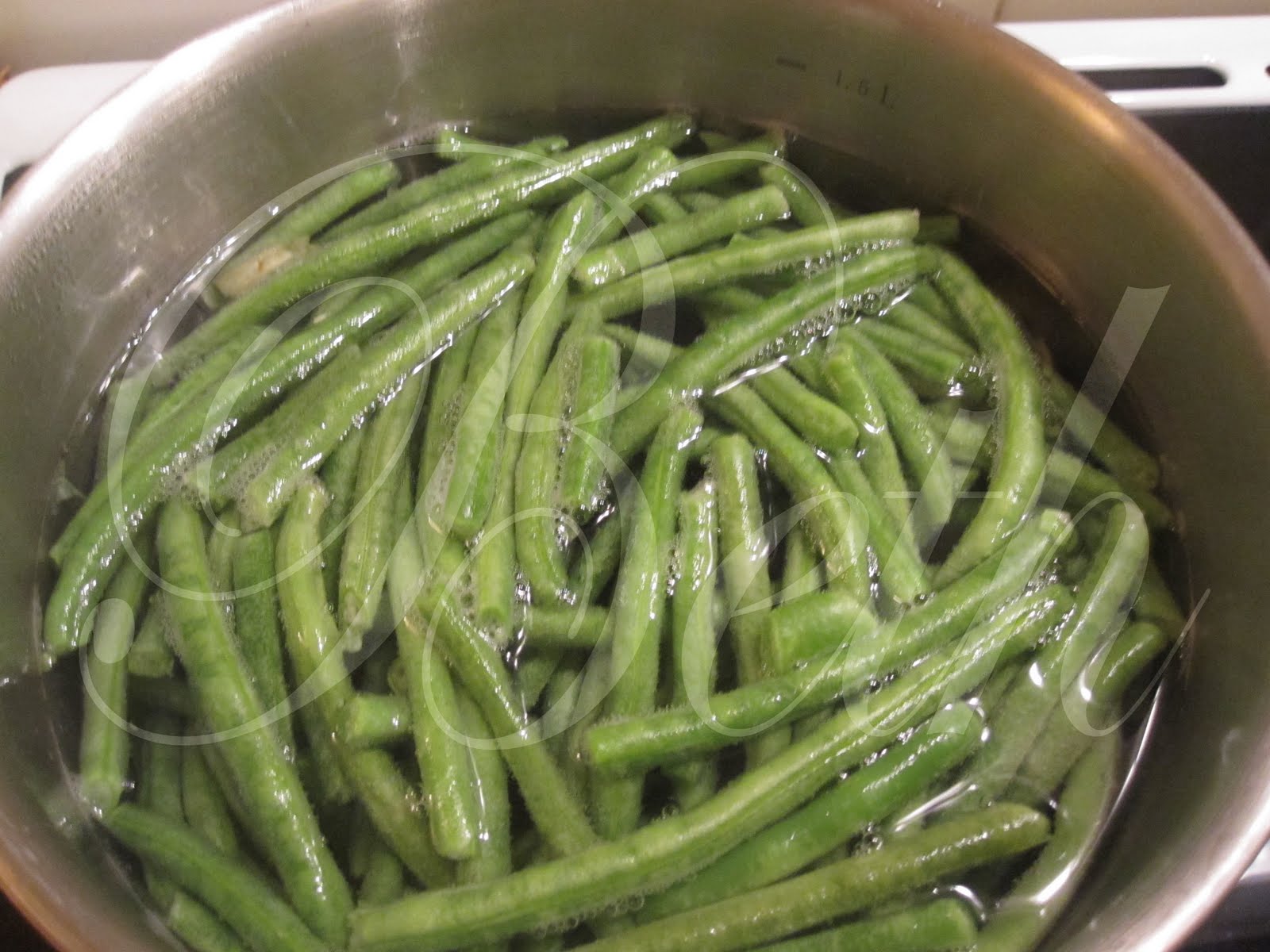 Leve o feijão verde a cozer num tacho com àgua, temperada com sal, durante cinco minutos apòs iniciar fervura.( eu utilizei feijão verde congelado)