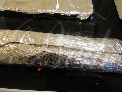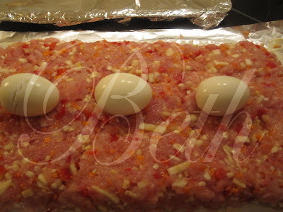 barre um folha de papel de aluminio com manteiga e espalhe a carne; coloque no centro os ovos cozidos descascados.