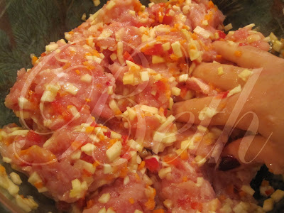 Versez dans le saladier quelques goûttes de la sauce, sel et poivre et les deux œufs, mélanger tout avec vos mains et réserver.