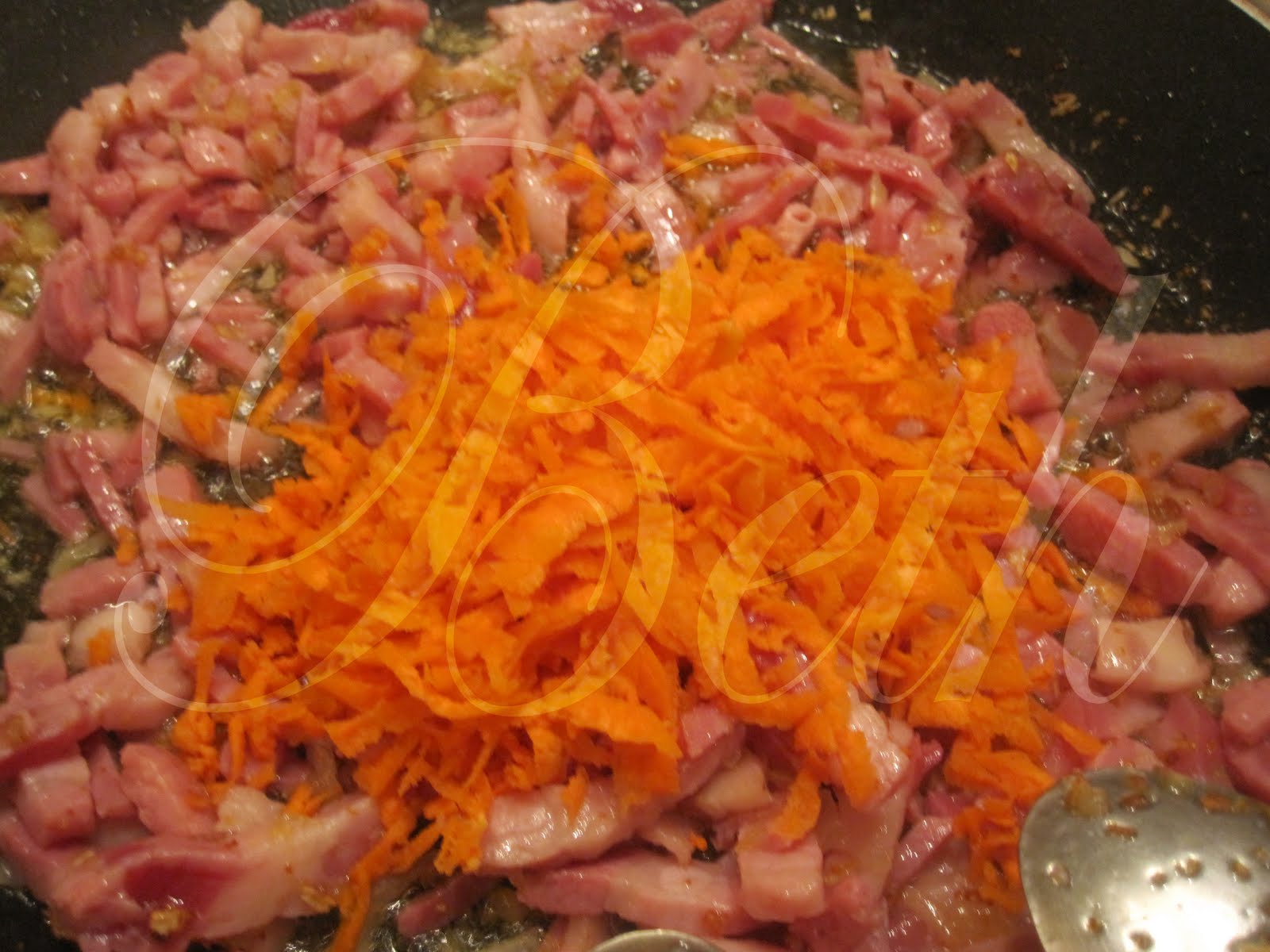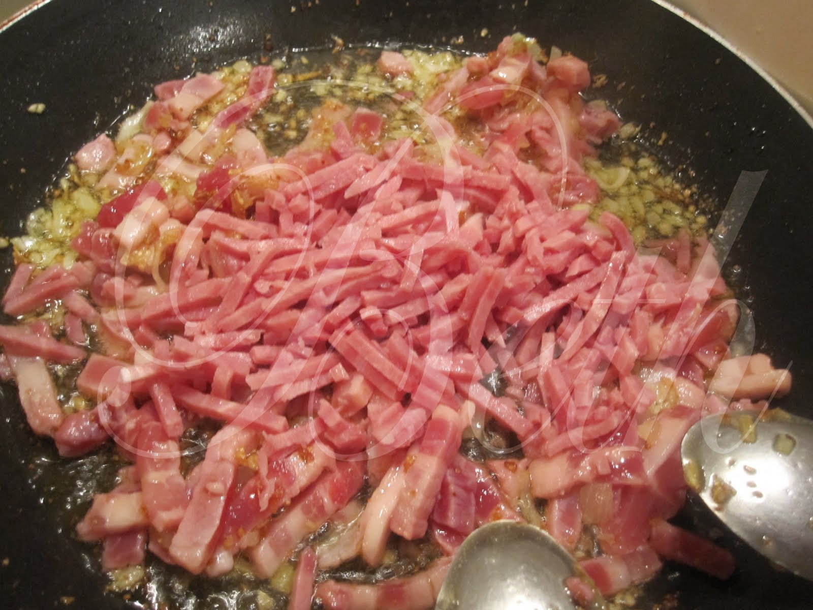 En attendant placer une poêle au feu avec l’oignon émince dans du huile d’olive avec l’ai en poudre, et laisser mariner un peut, quand l’oignon commenceras à dorée un peut vous additionner le concentré de tomate le bacon, jambon et la carotte, mélanger bien et laisser quelques minutes.