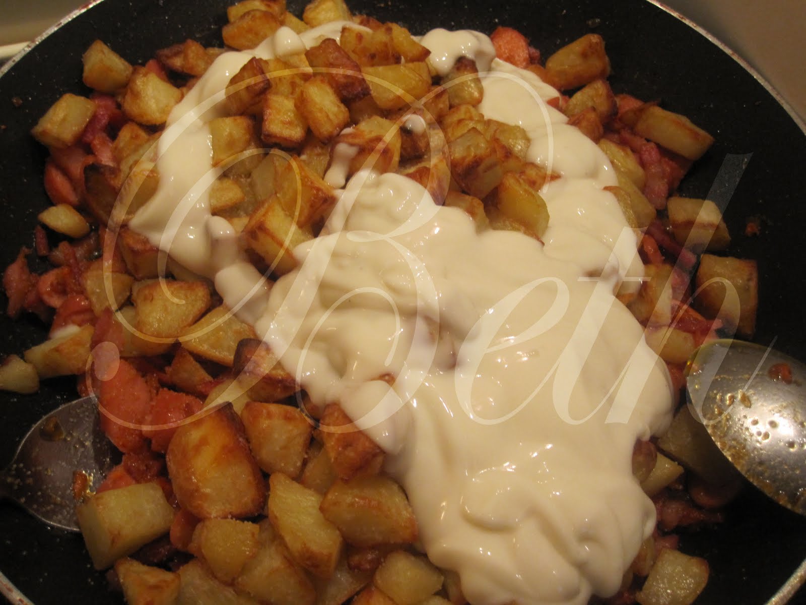 une foi les pommes de terre frites versez-les dans la poêle et additionner la crème béchamel, mélanger et assaisonner si besoin.....