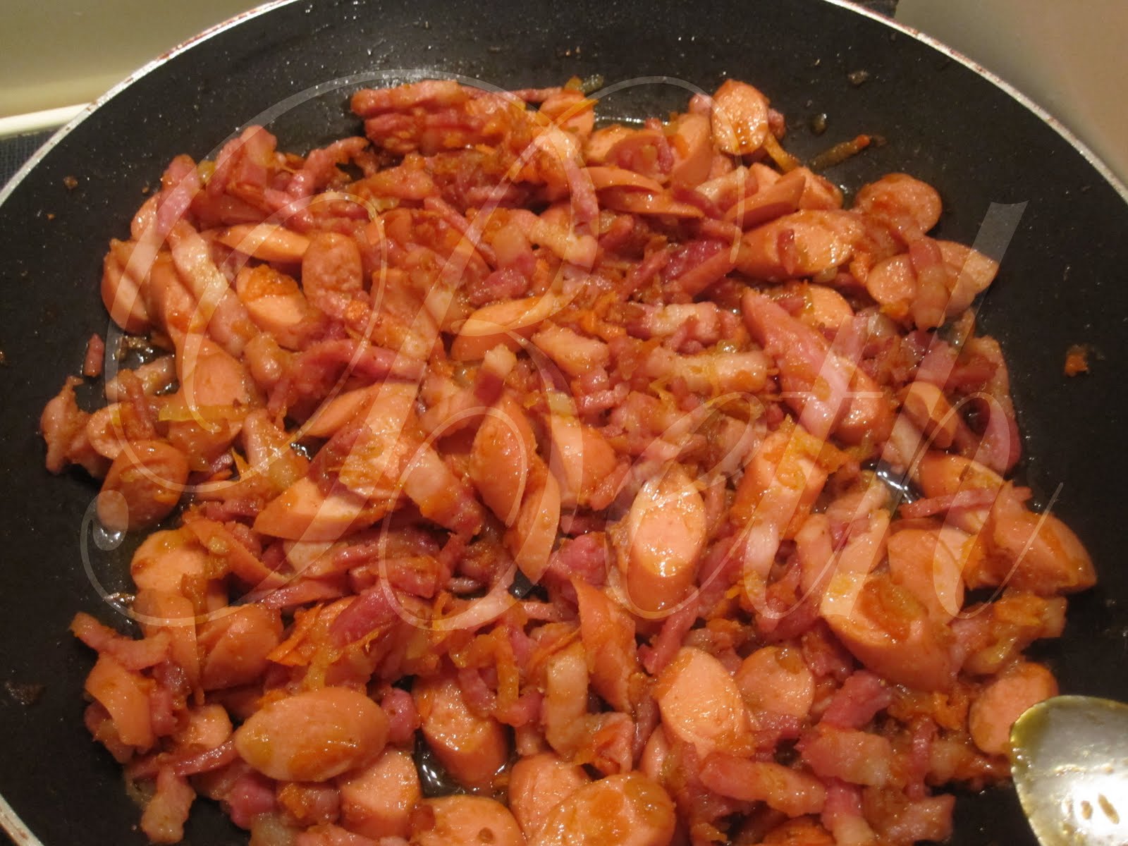 Les pommes de terre sont frites…placez-les dans la poêle ainsi que les saucisses et la béchamel, saler et poivrez, mélanger le tout et versez tout dans un plat à four beurré, versez par dessus la mozzarella râpe et portez au four à gratiner quelques minutes juste le temps de la mozzarella fondre et dorée.