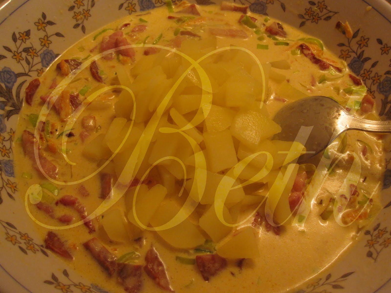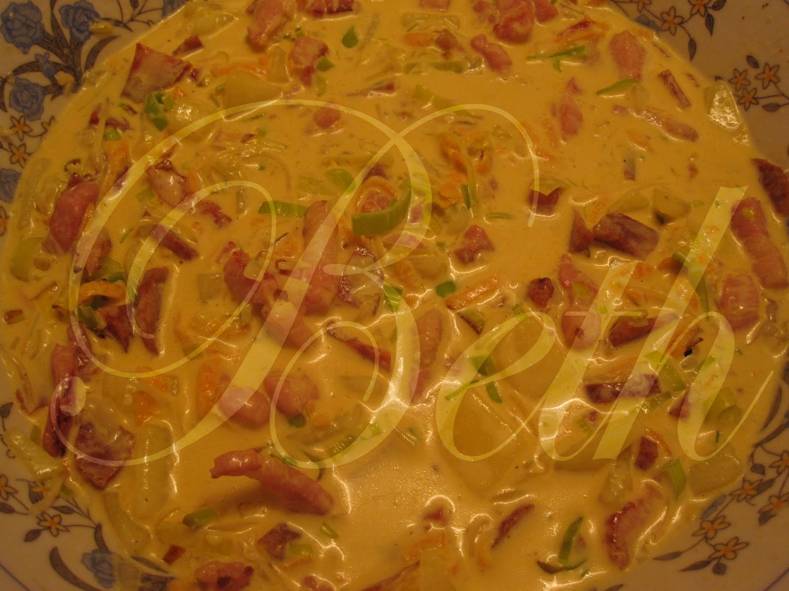 La carotte, le poireau, lardons, la saucisse, les pommes de terre, le compté râper, mélanger tout avec une cuillère.