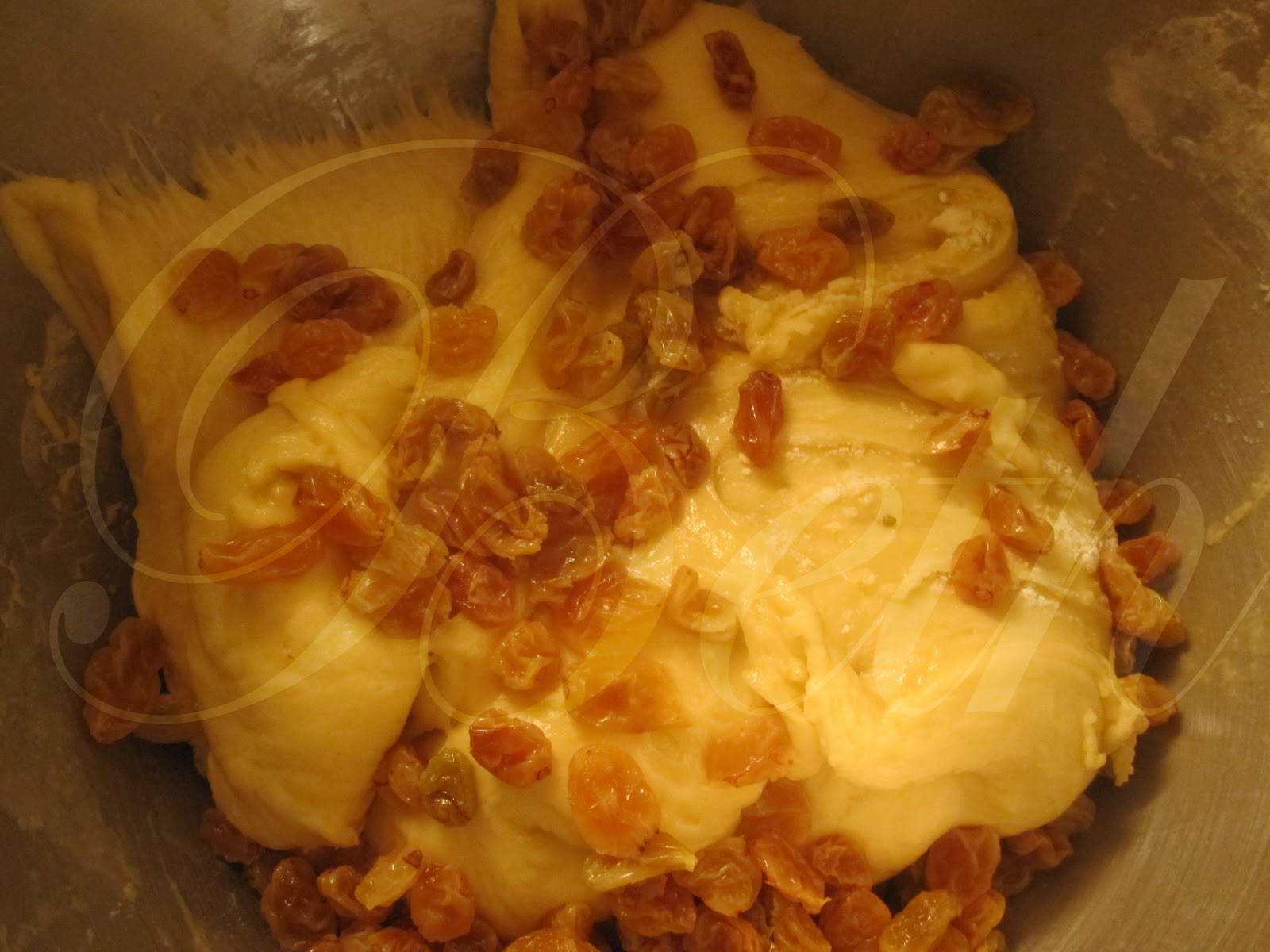 depois da massa ter levedado uma primeira vez, volte a colocar-la no robot adicione as uvas passas e envolva alguns minutos.....