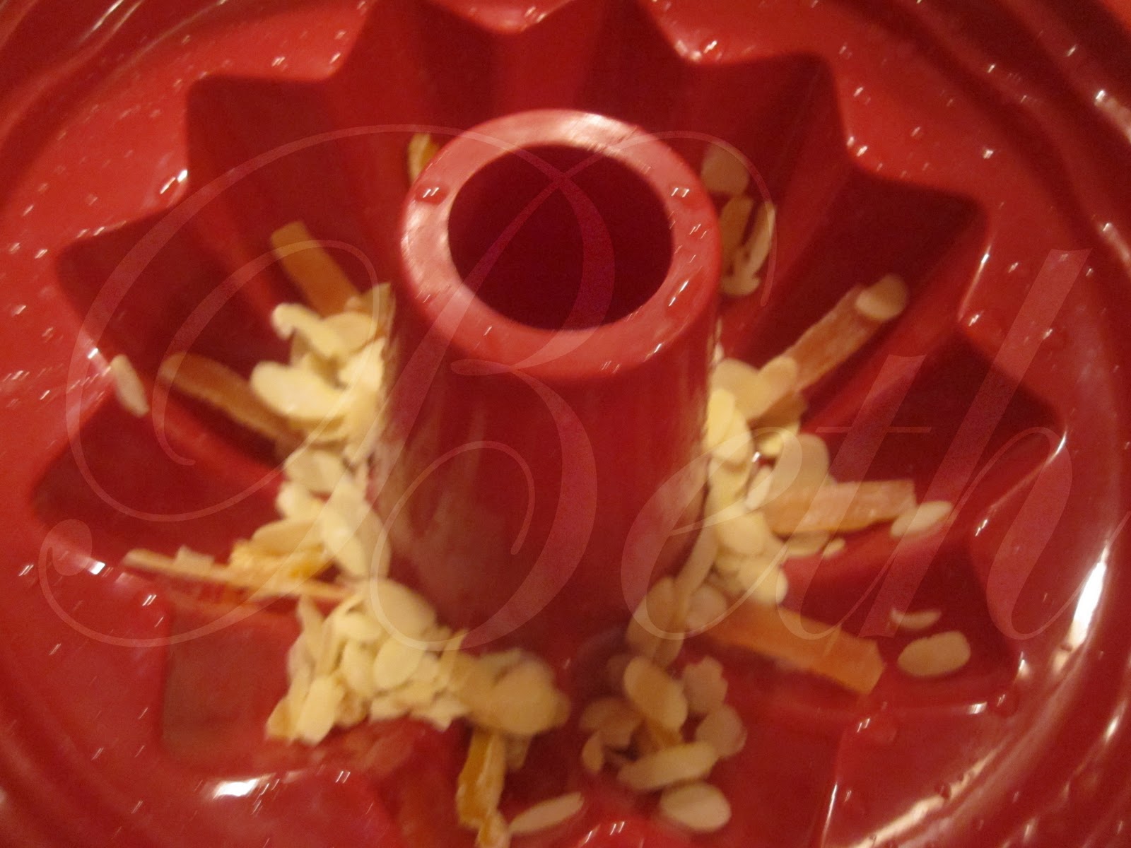 no fundo de uma forma coloque a amendoa laminada ou inteira eu também coloquei alguma fruta cristalizada no fundo......