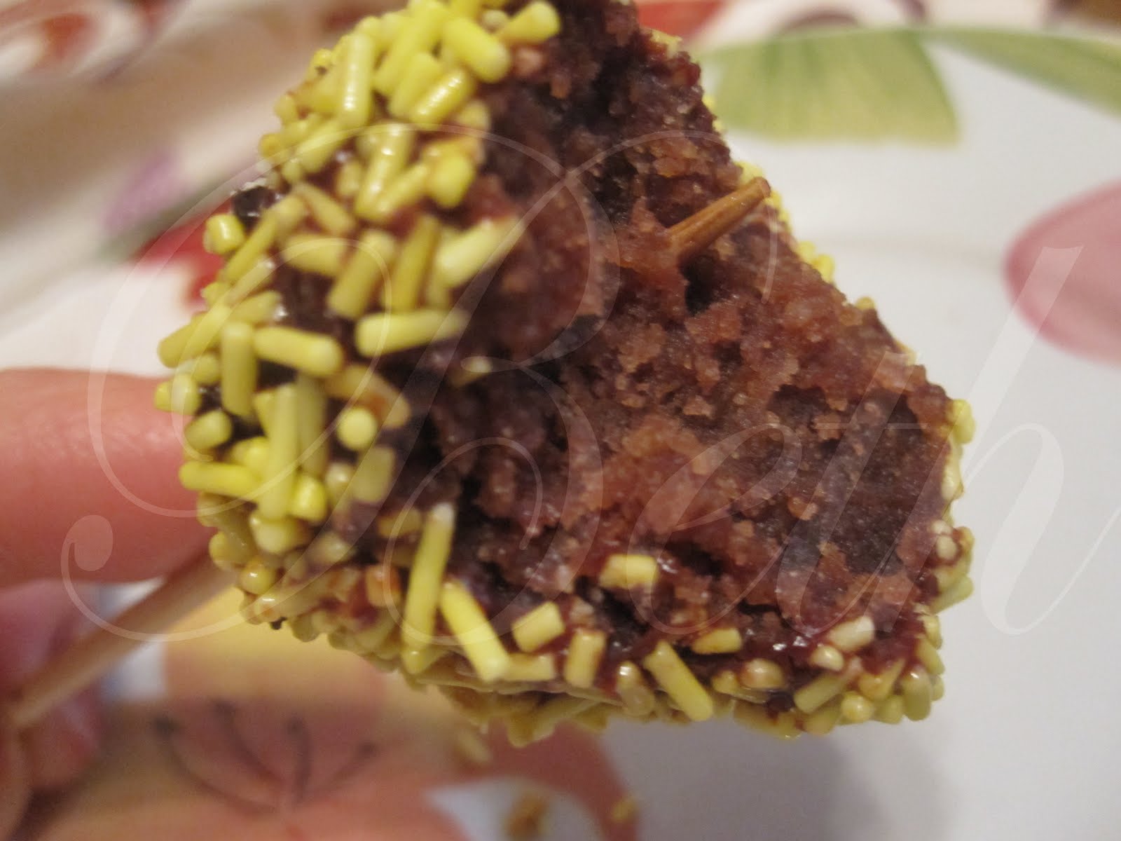 Retirez les boules du frigo avec l’aide de deux fourchettes roulez-les dans le chocolat fondu, passez-les dans les vermicelle et enfoncé un petit bâton jusqu’au centre de chaque petite boule, déposez-les dans un grand verre et porter au frigo jusqu’au moment de servir.