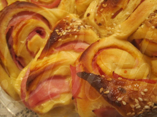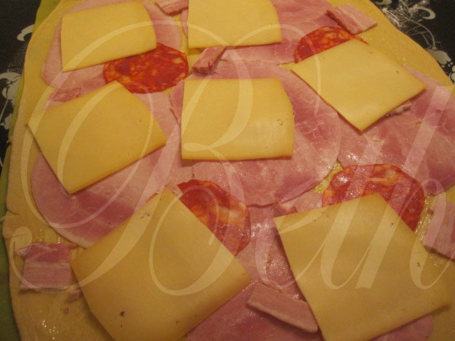 une foi votre pâte préparé au robot et levée une première fois, vous étaler la pâte et si vous le désirez barré avec un peut de beurre liquide..... déposer le jambon, le chorizo et le fromage.....