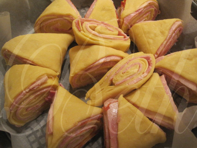 Le temps fini, étaler la pâte à l’aide d’un rouleau pâtissier, garnissez votre pâte, enroulez et couper le boudin en petits triangles.