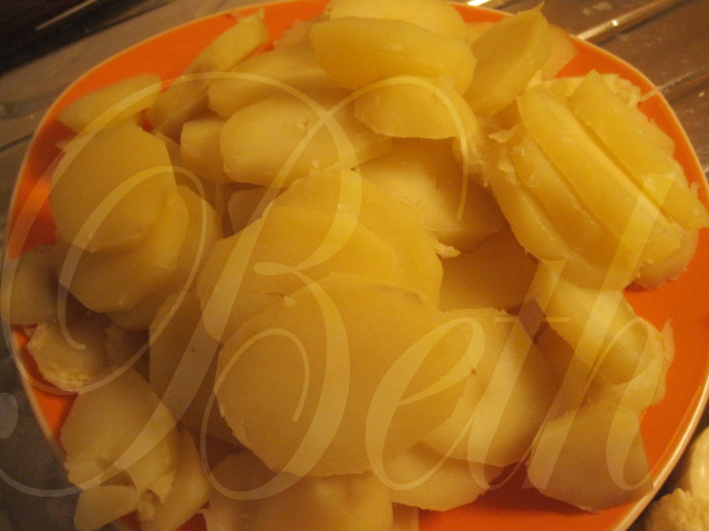 coza as batas, corte-as as rodelas e reserve.....na sertã coloque a cebola e o ardon deixando cozinhar 5 minutos.....
