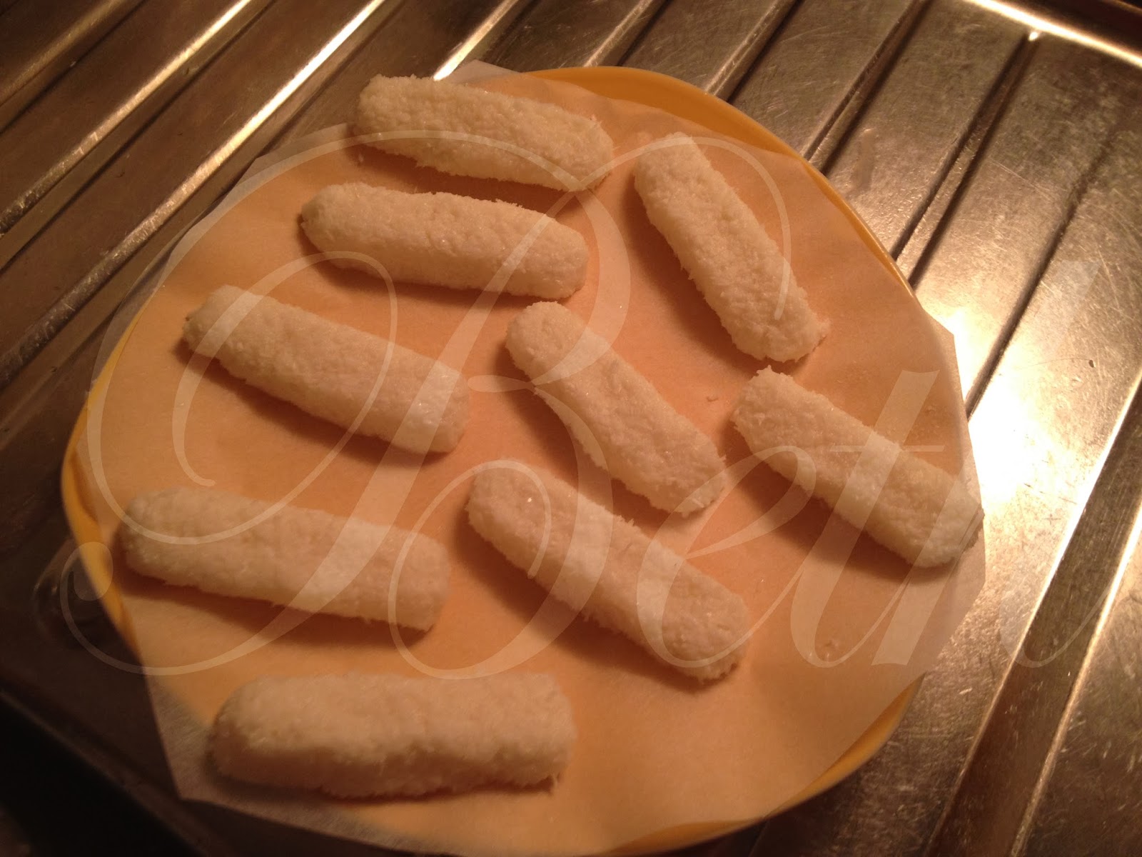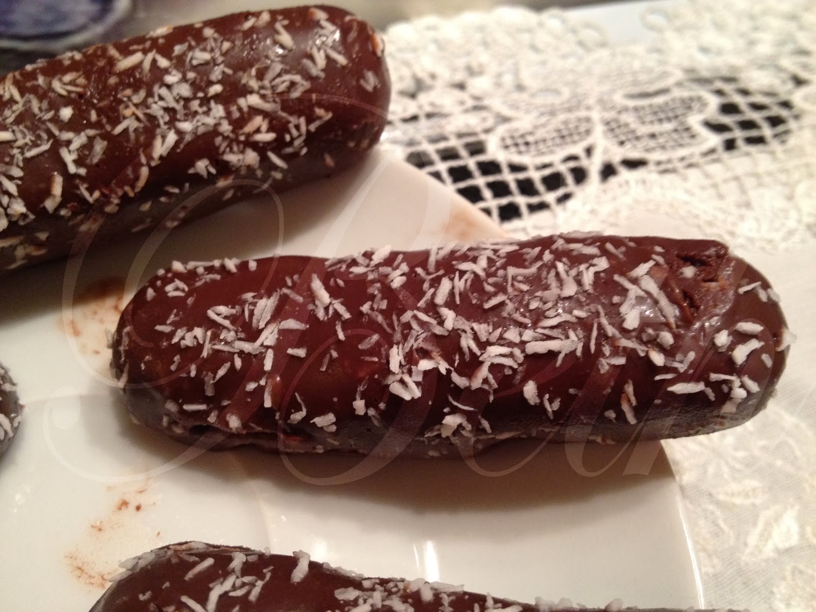 Forme pequenos rectanglos com as mão até lhe dar o formato desejado e leve ao frigorifico durante 1 hora. Derreta o chocolate juntamente com a margarina, creme fraîche e o  açucar em po.