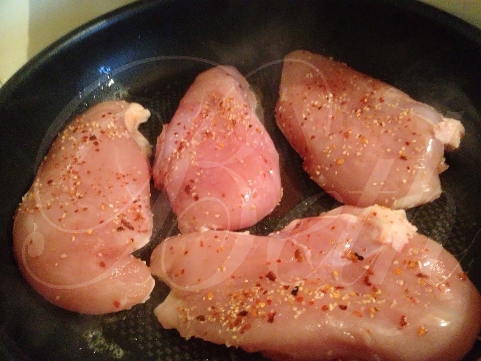 Assaisonner les escalopes de poulet, faites les dorée dans la poêle dans un peut d’huile l’olive, jusqu’à qu’il soient joliment doré.