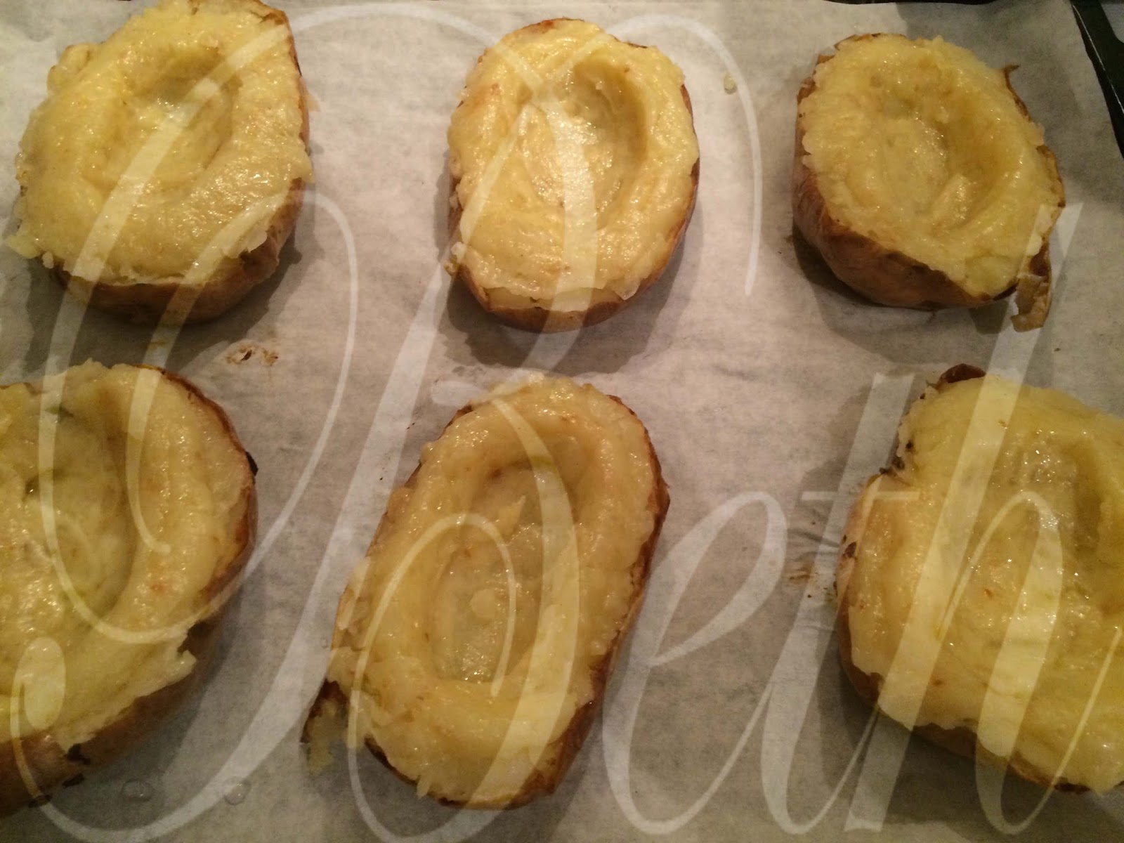 Placez les coquilles de pommes de terre sur la plaque de cuisson et les garnir avec le mélange. Appuyez sur le mélange avec une cuillère pour l'ensemble est formé un trou pour faire de la place pour les œufs.