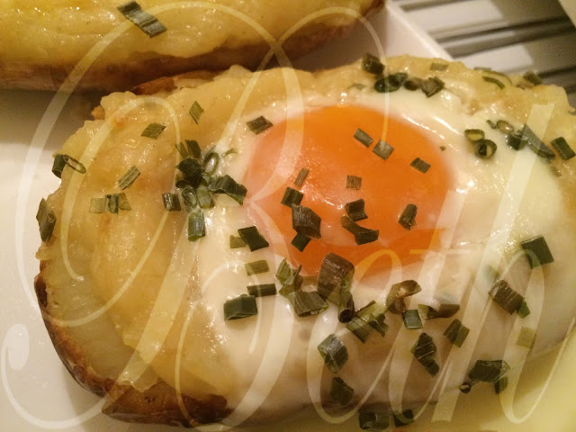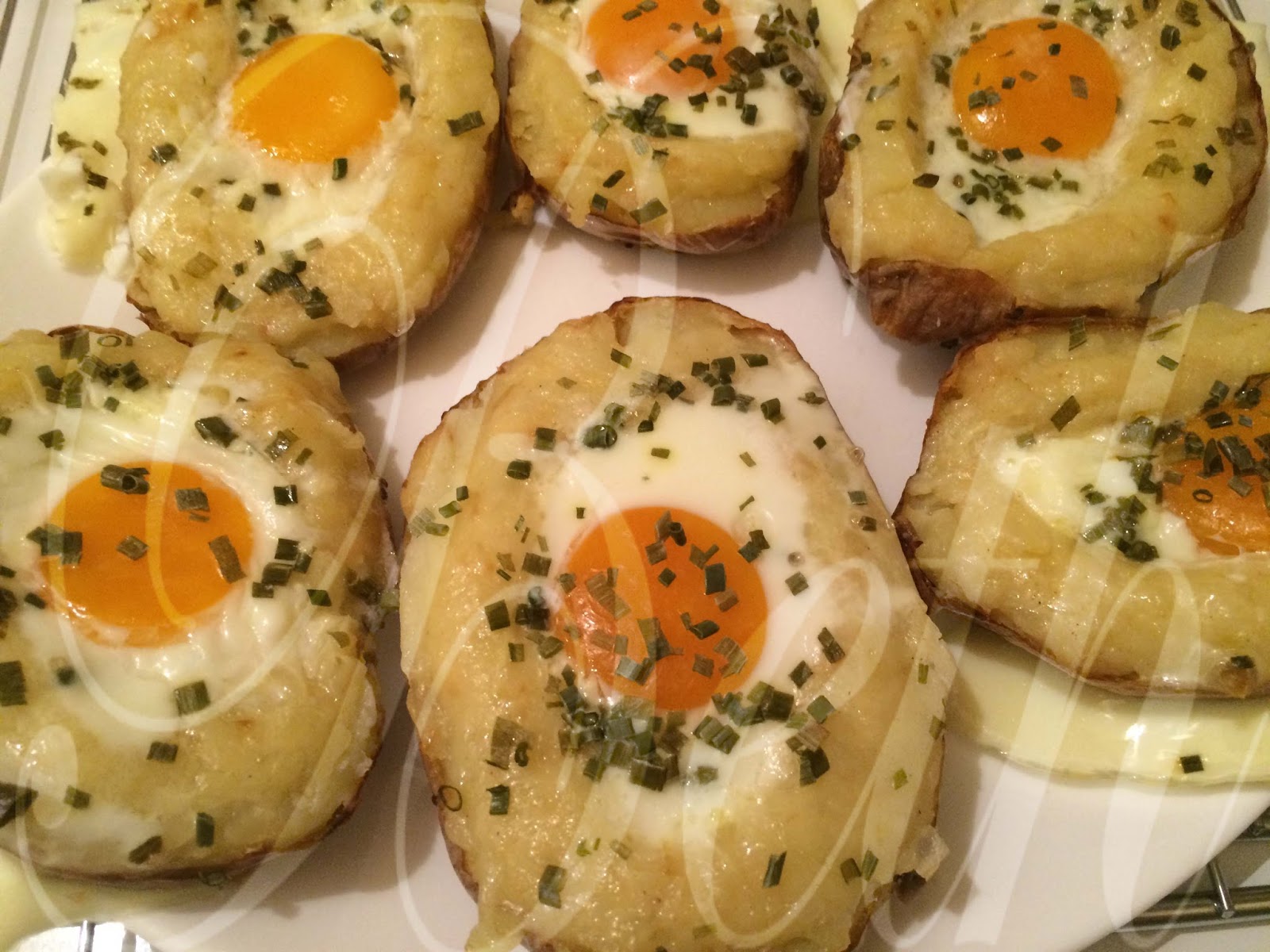 Saupoudrer de ciboulette sur le dessus et casser un oeuf sur le dessus de chaque pomme de terre farcie.