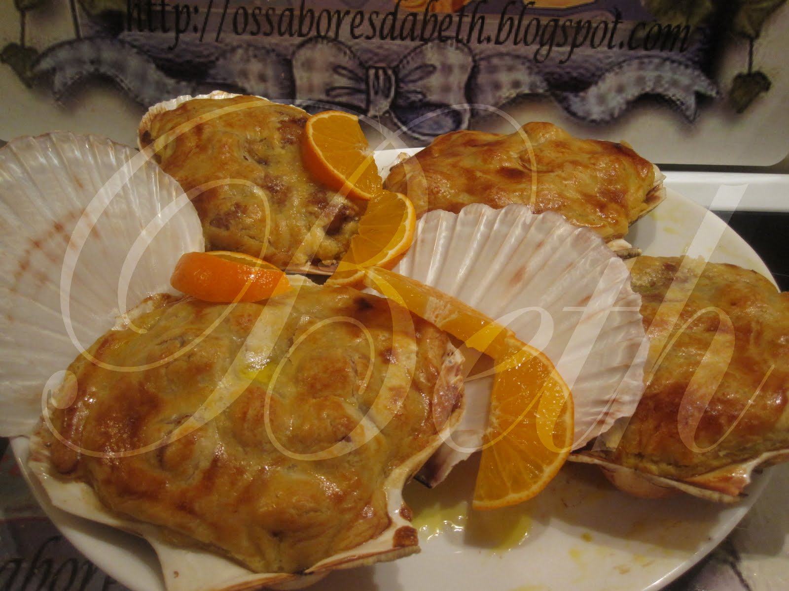 retire a massa folhada reservada no frigorifico e coloque-a por cima de cada concha virando o interior da massa folhada para dentro da s conchas.....