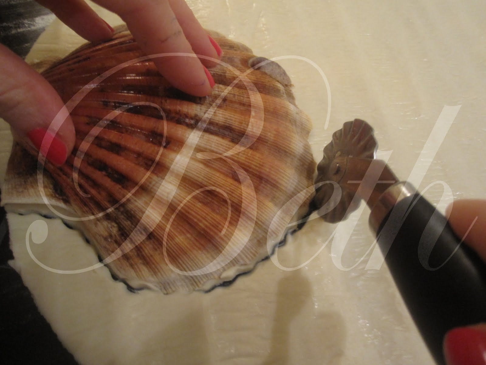 prepare a massa folhada, utilise a concha como modelo para cortar a massa folhada, reserve a massa folhada jà cortada no frigorifico até ao momento que você vai presisar.....